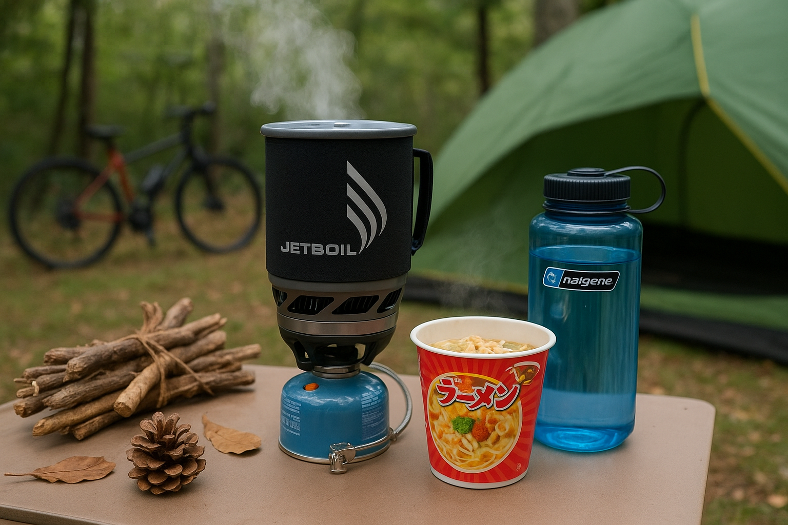 自転車キャンプはライド後の疲労がたまっている中でテント設営、食事準備などをします。普段生活していても疲れているときは家事を負担なく済ませたいですよね?自転車キャンプも同様で、手早くお湯が沸くギアがあると食事が格段に楽です。私はジェットボイルフラッシュを愛用していて、約2分でお湯が沸くのでカップ麺やコーヒー、スープがすぐ作れます。おなかがすいているときに外で温かいものがすぐに食べられるだけでとてもおいしく感じます。ゴトクが付いているので簡易調理も可能で便利です。